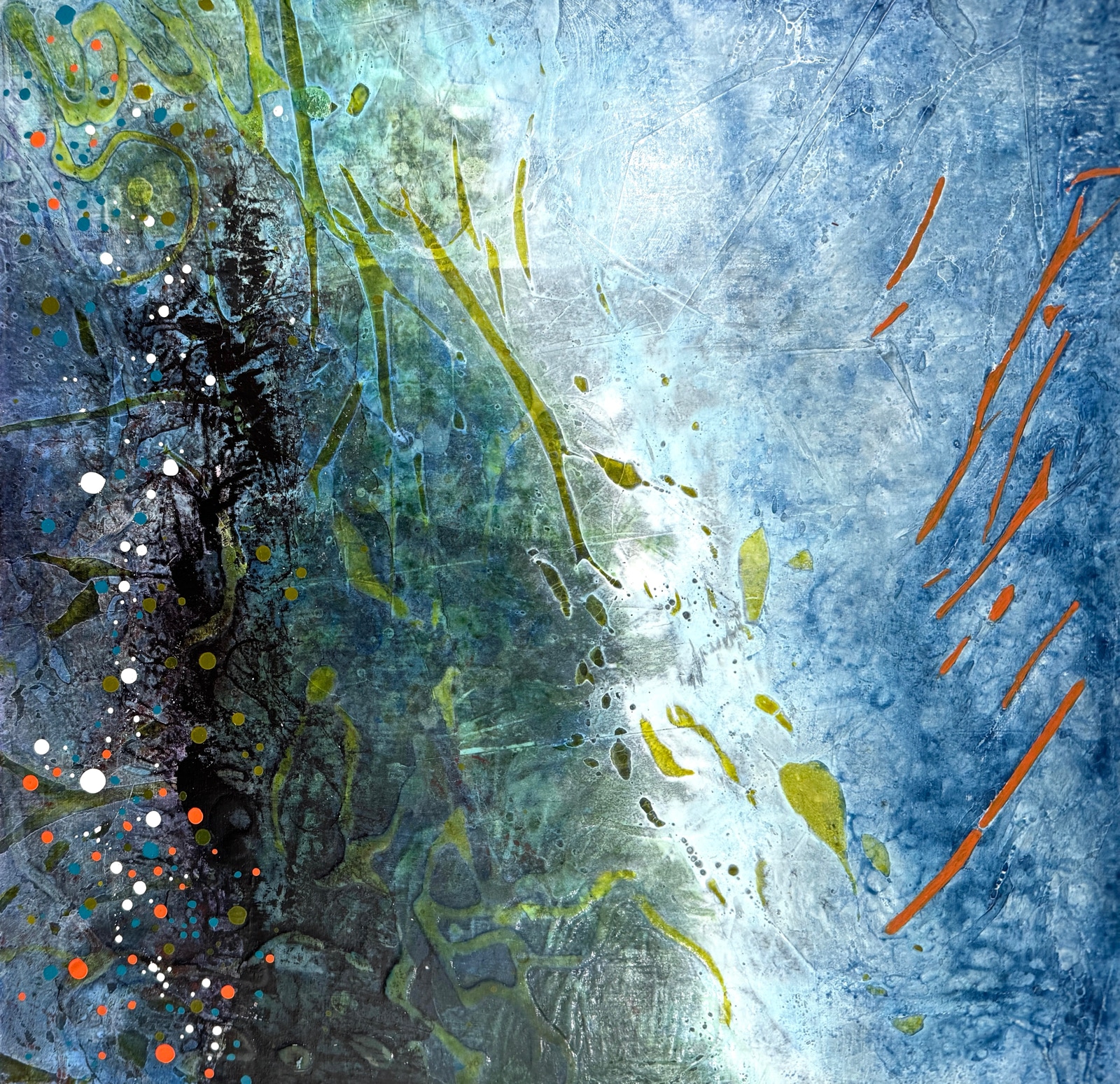 Acrylic, collage mixed media, oils on cradled pane.l. 12” x 12” (30cm x 30cm) in 2” deep maple floater frame..