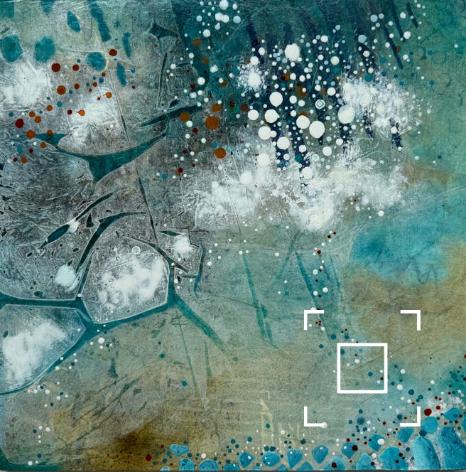 Acrylic paint, collage, mixed media on birch wood panel, in black floater frame 12” x 12”