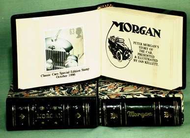 The frontispiece for each book is a Royal Mail postage stamp of a Morgan car from the Classic Car Series, October 1996. The foreword was written by Peter Morgan and the books are signed by him. I used to live just a few miles from the Morgan factory and would take the books in for him to sign as they were finished. He went in to work every day (health permitting) and was unfailingly courteous, always asking who the books were for, and he very often knew the purchaser. A few months before he died, I moved to Canada, and decided not to complete the edition without his signature. The edition is therefore terminated at 71 copies.***