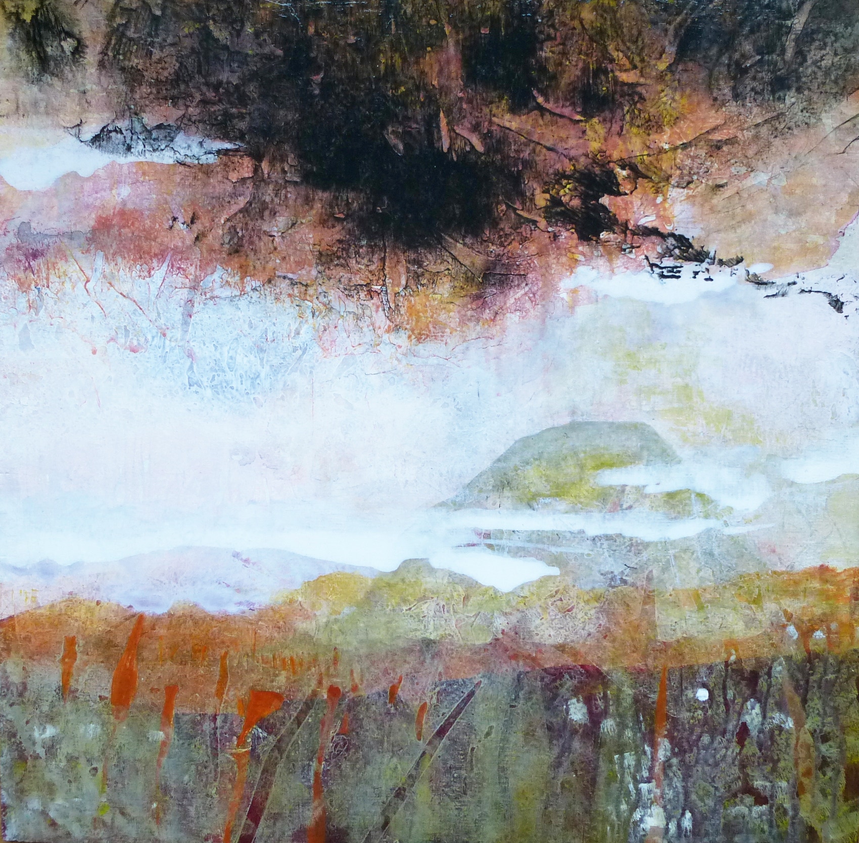 Acrylic, collage mixed media, oils on cradled pane.l. 12” x 12” (30cm x 30cm) in 2” deep maple floater frame..