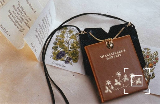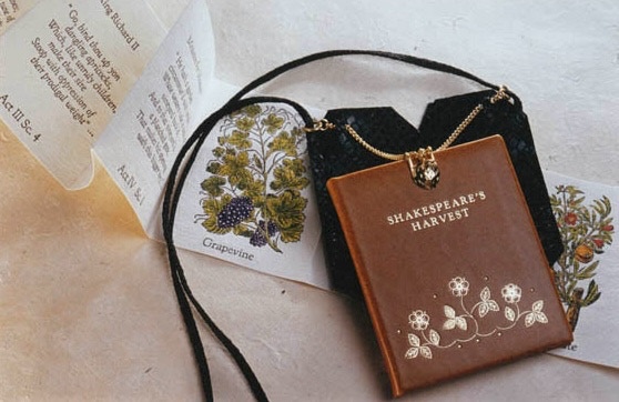 Falstaff called for eryngoes to aid his love tryst, in the Merry Wives of Windsor. The long, sweet-tasting candied roots were thought to have aphrodisiac properties and were taken medicinally. Shakespeare’s Harvest was designed as a companion volume to Shakespeare’s Flowers and develops the idea of ‘books as precious objects’, to be treasured and enjoyed, as were Books of Hours in Medieval times. It can be worn around the neck, suspended in its case, from the silky neck cord.