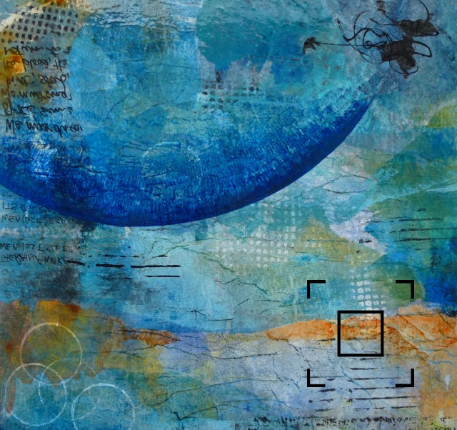 Acrylic paint, collage, mixed media on birch wood panel in white floater frame.