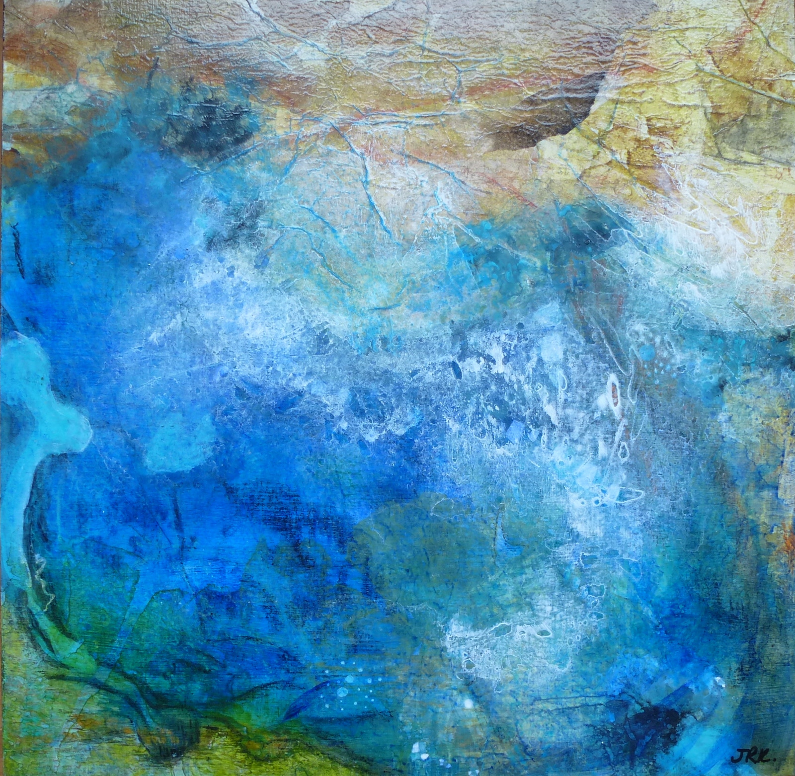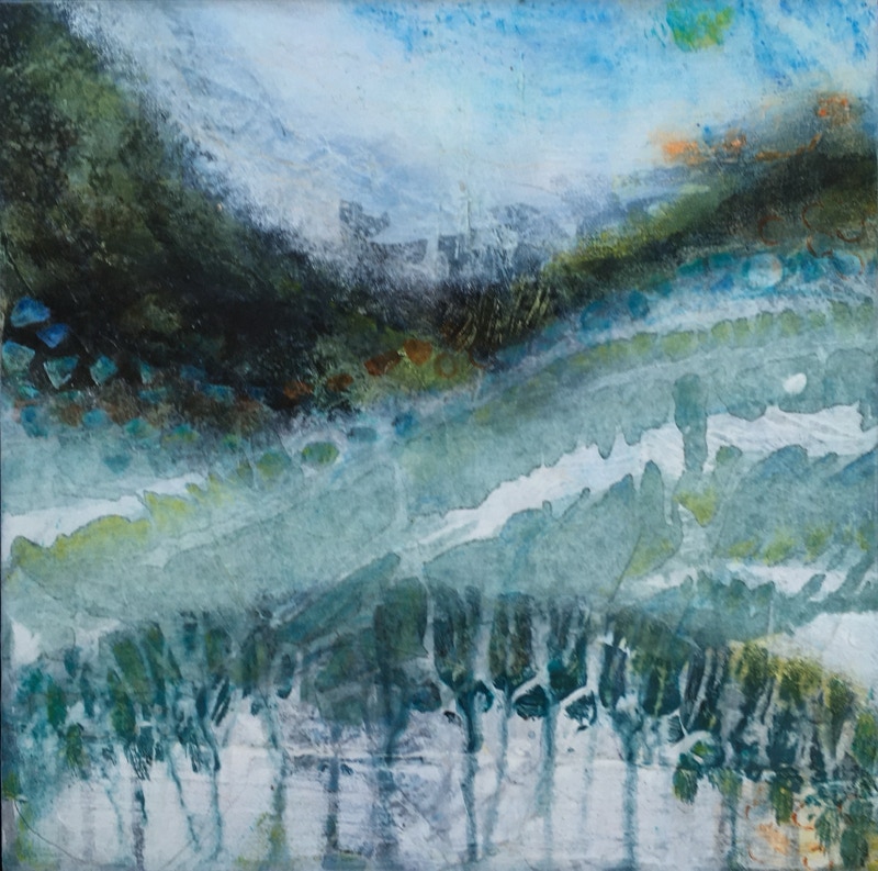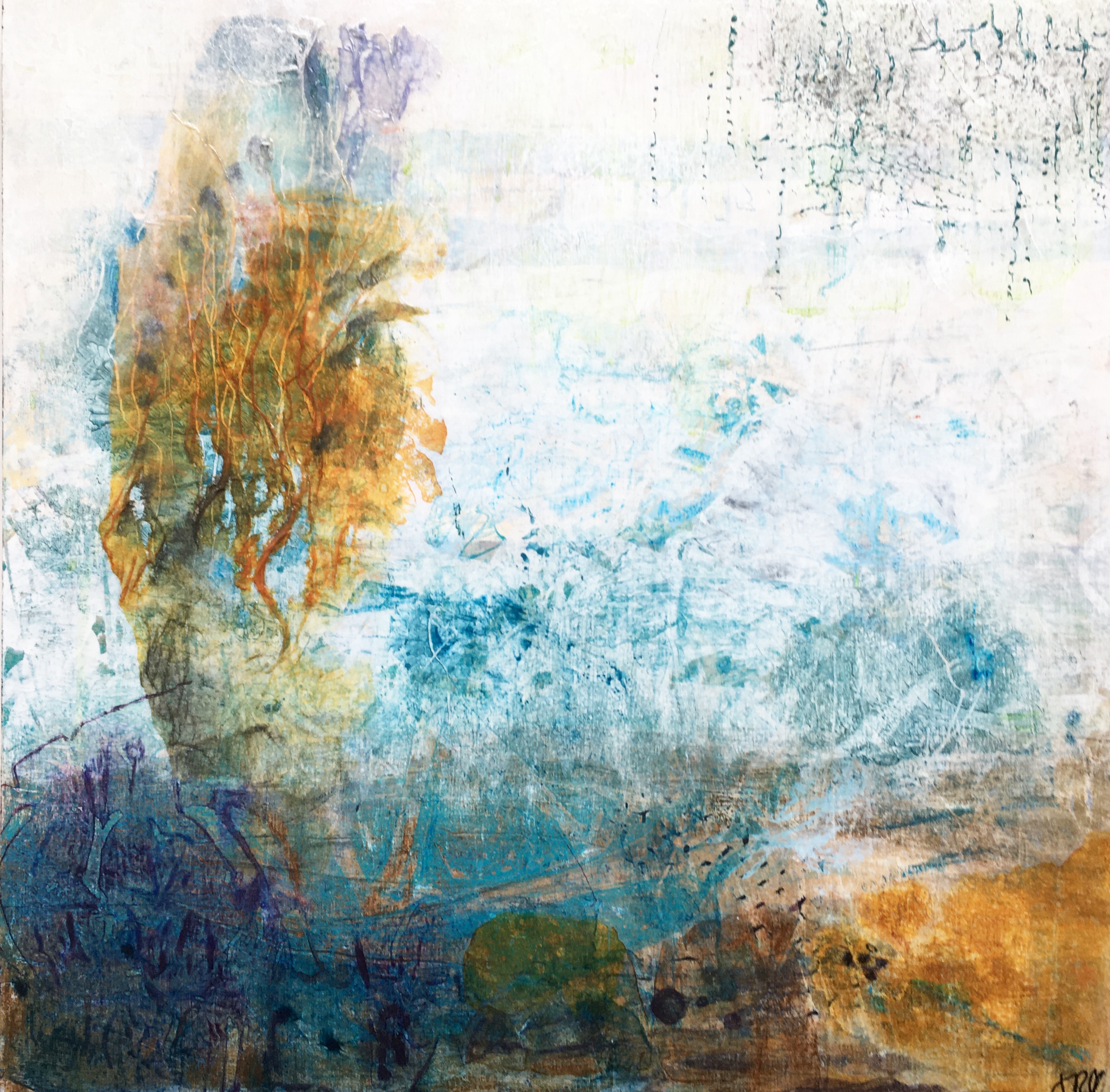 Acrylic paint with collage on birch wood panel, in dark wood floater frame. 12” x 12” (30cm x 30cm.)