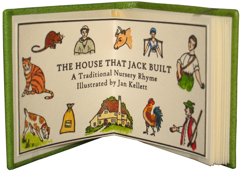 Printed on Magnani mould-made paper, this book is the first to come off the old Craftsmen hand-operated platen press, purchased by De Walden Press in 2004. Combining modern technology and traditional methods, photopolymer plates were made of the artwork and text, making it possible to letterpress print both together. Interestingly, this mimics the old method of hand engraving metal plates with both text and illustrations, as can be seen in some of the early 19th century versions of this rhyme.